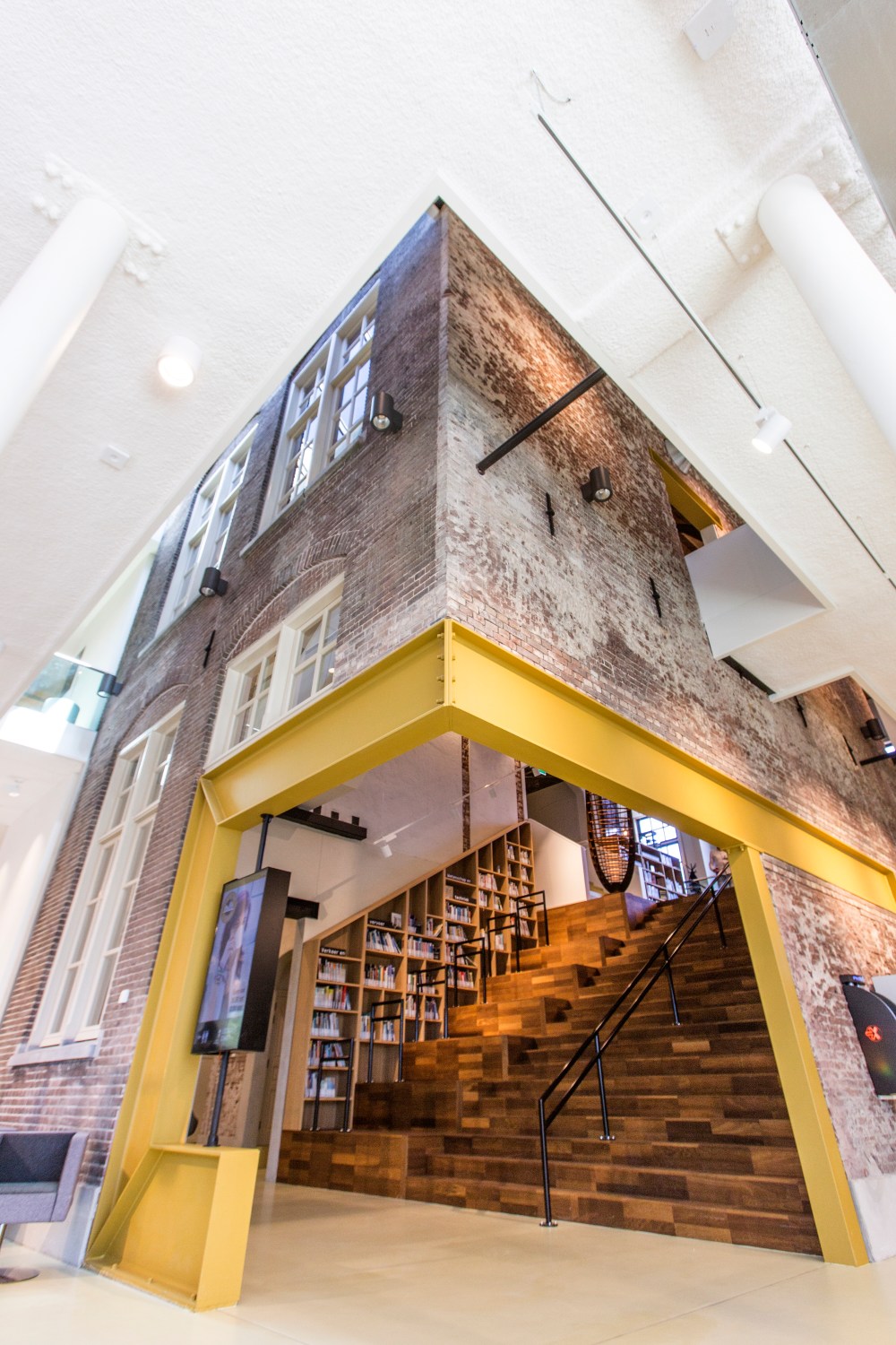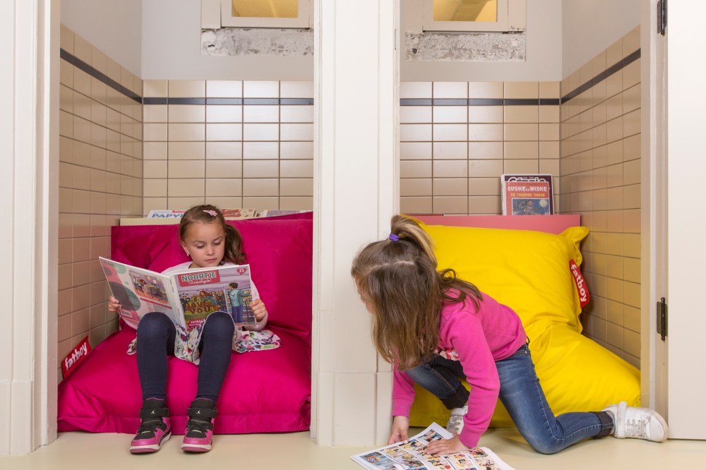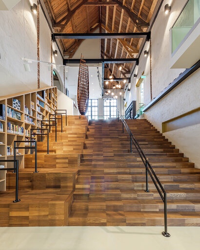 The giant staircase, that can also function as a tribune, forms the heart of the building. The old structure of classrooms, hallways and toilets have been left intact. What once functioned as the toilets has now been transformed into small reading corners for children or places to study. The extensive book collection can be found in the new part of the building. The new and the old part of the building are connected through multiple staircases and bridges, resulting in a clear distinction when you walk from one part into the other.