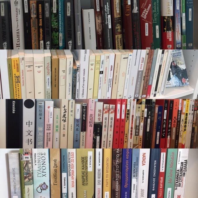 A white room is filled with shelves of many styles that offer many reading materials: from books to magazines. One of the main features is their international languages literature. They have books in greek, spanish, chinese, arabic, french and many others. This proves their awareness of who is visitng the library and how they can meet their needs.
