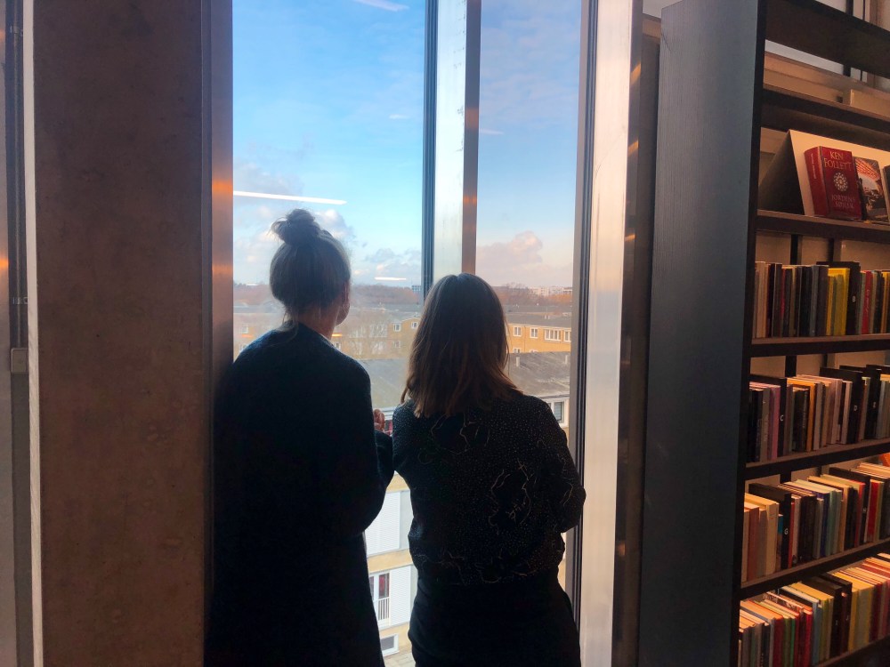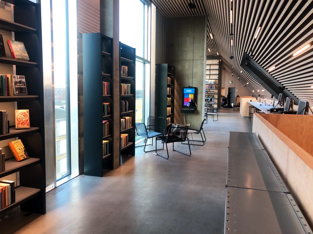 The library has the most amazing smell og new wood and a cute little reading area with ‘shoe parking’ outside it.