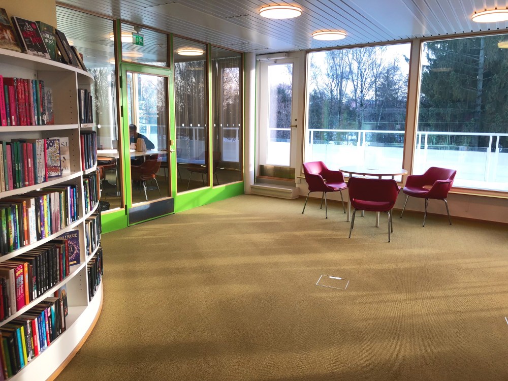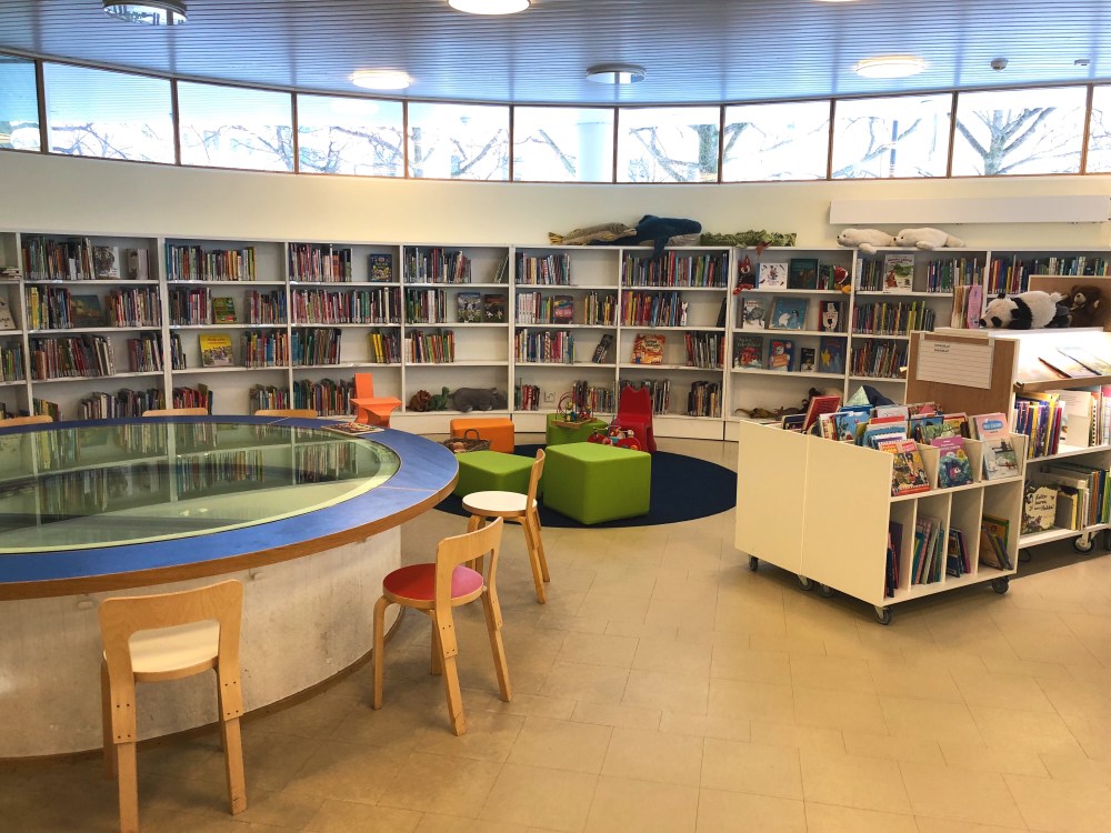 The childrens library is small and cosy. It has equal parts childrens furniture and playarea and lounge furniture for their parents facing the gigant windows and the view of the beautiful birch trees in the park.