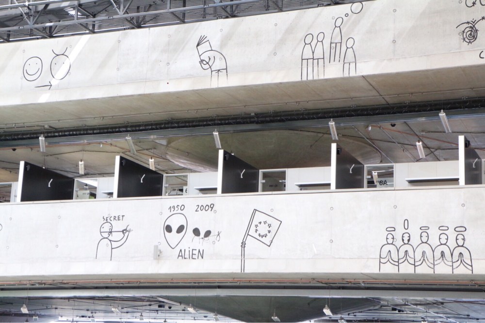 The centerpiece of the award-winning building is a rectangular, five-story open atrium with stairwells and elevators enabling access to all public areas. Over two hundred avant-garde, “comics-style” drawings by Romanian artist Dan Perjovschi (one of the only such permanent installations by the artist) adorn the atrium’s concrete walls.