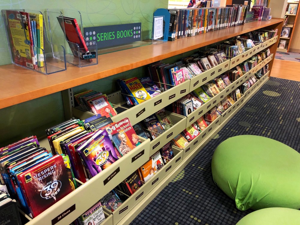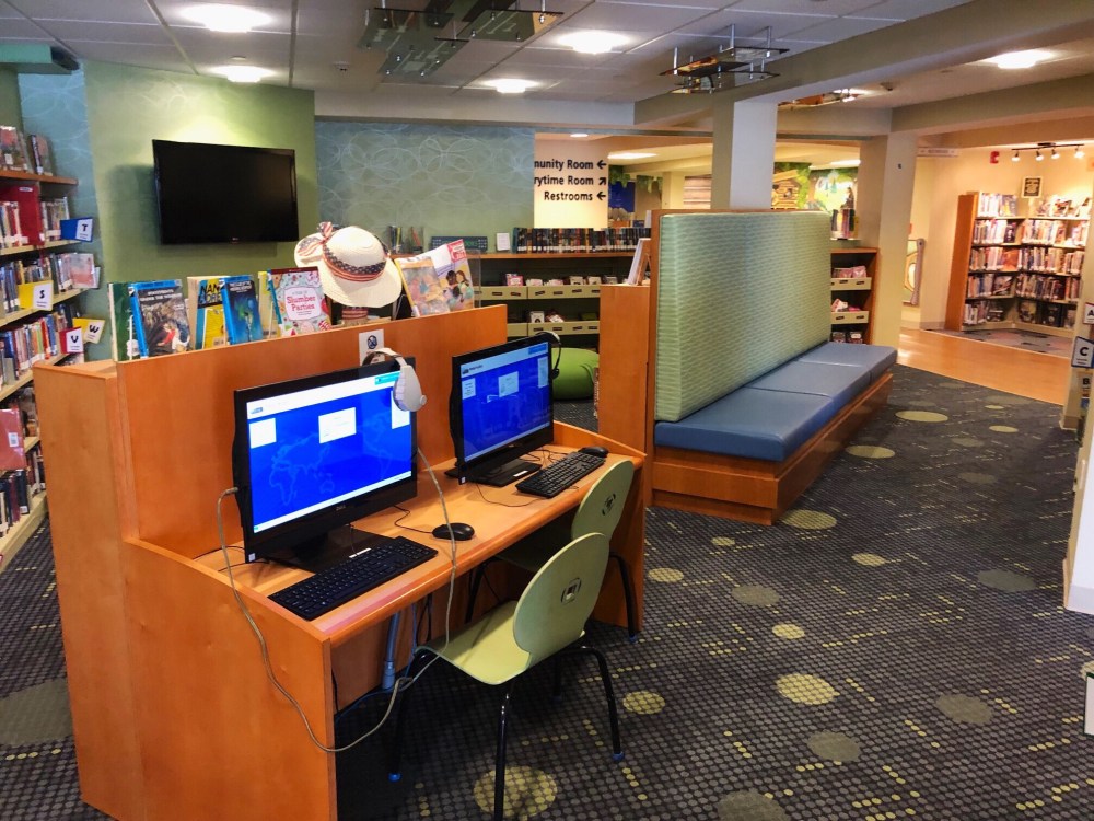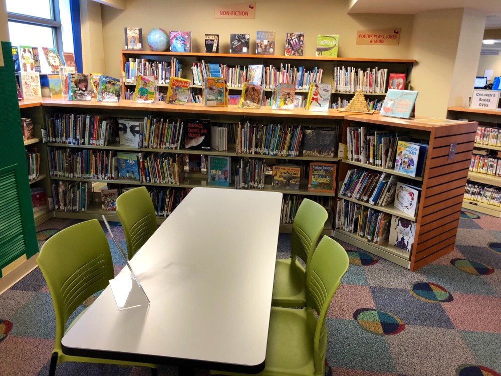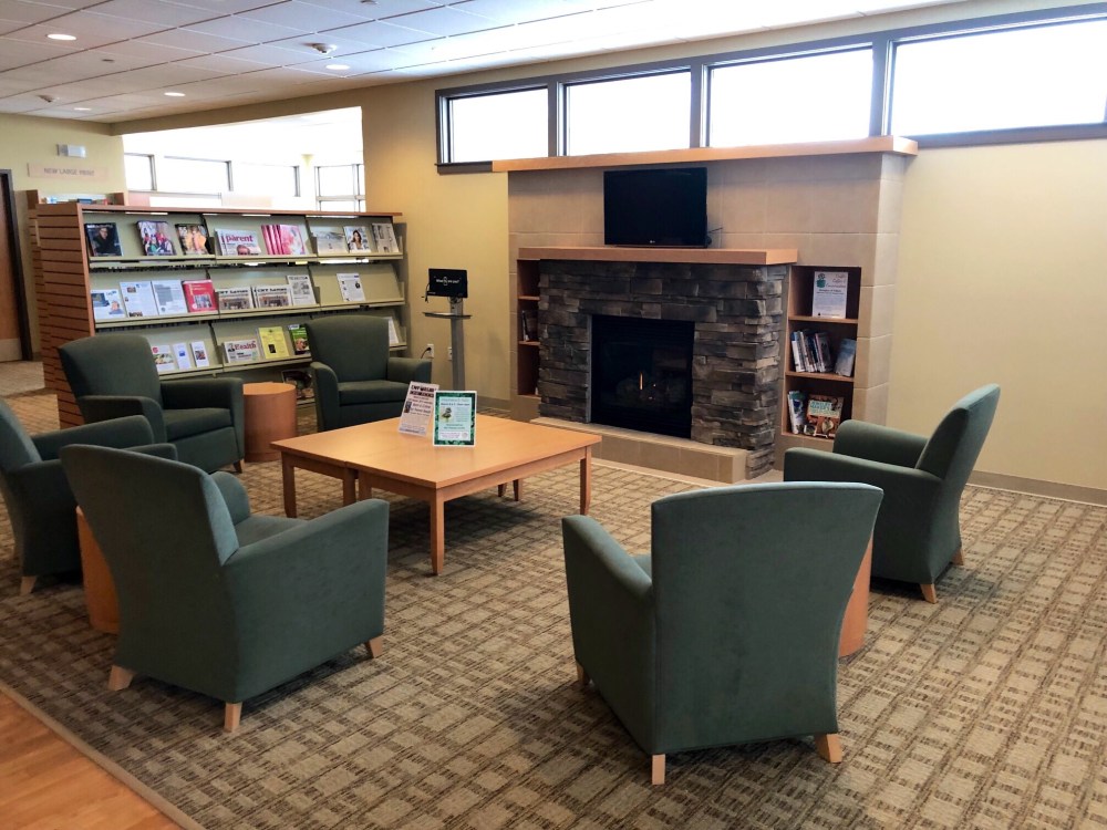 There is both elevator and stair access to upstairs. The first place you see upstairs is the art gallery space. Community members can hang their work for a month and sell their work here. Sometimes they even feature children’s art from the local community! Next, you come to the fireplace. The area is cozy and inviting, especially on snowy days. There is a coupon exchange near the fireplace. If you continue straight, you come to the large print area. There is a puzzle hiding here for patrons to work on. There is also a senior computer. When you turn, you see magazines, new books, vending machines, and a reference desk. The teen area is on your right and features computers, games, books, and graphic novels.