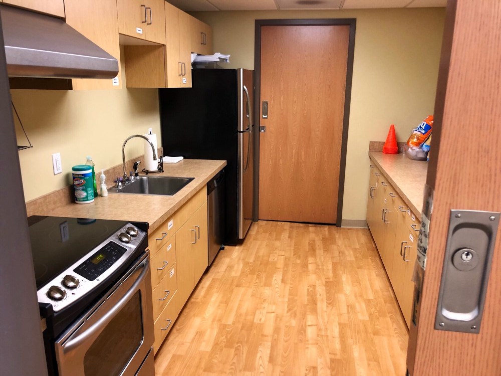 The community room is also on the first floor. The space is huge! It also has a full-use kitchen complete with fridge, freezer, stove, oven, sink, dishwasher, and microwave! The community room is available for programs that are open to the public and are for non-profit purposes. The library also hosts programs here and even streams movies for the public!