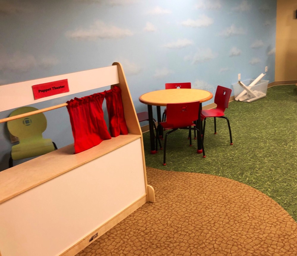 The children’s area is a gem! Everywhere you look there is something fun hiding among their amazing collection of books. The nonfiction area has a lego wall, a STEAM cabinet, animal toys, and more. The fiction area has computers for kids only, a board game cabinet, Playaway Launchpads, and fun seating. As you continue down the hallway of the first floor, it opens up the a beautiful children’s picture book area with a mural of animals reading and playing. Bigfoot is even hiding in there! Puzzles, trucks, blocks, baby dolls and more are everywhere you turn. The picture books are face-out which is fantastic for letting kids be self-reliant in picking out what interests them the most. Picture books are shelves by authors last name and by categories like “Manners” and “Construction.” There is a parent PC in the children’s area and 5 children’s AWE computers which have pre-loaded learning games on them. There is also a parenting section in the children’s area which focuses on raising babies and toddlers. As you continue to walk back, you find the story time room. It has a magnet board that has different games that are rotated. A favorite is where kids move piping and build a maze that they can send balls through. There is a puppet theater and a dress-up wardrobe complete with accessories and a mirror. There are more games hiding back here too.