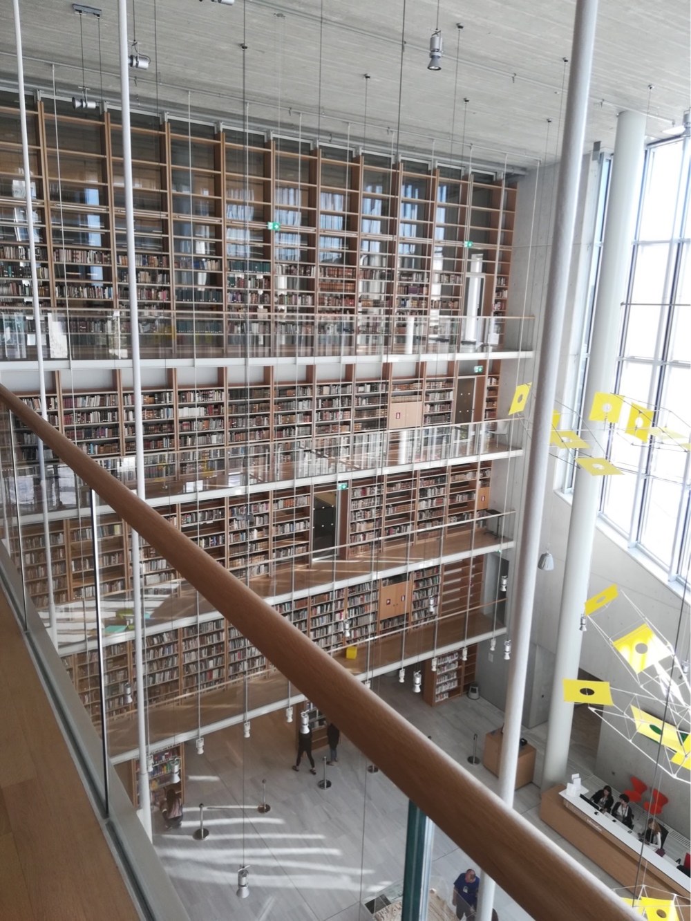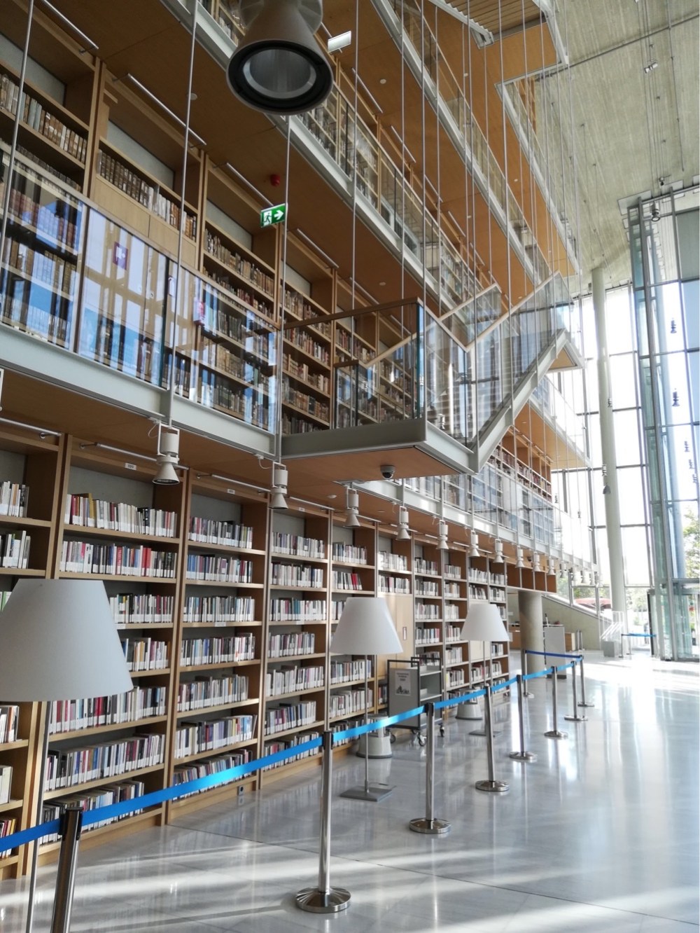 The building is spacious, is very well-lit, with its glass walls letting in light in vast quantity – which is turning to be a bit of an issue for the books more exposed to the sunlight. The ground floor hosts a lending collection and dedicated areas for children and teenagers. I loved the “nests”, as they called them, with sofa and TV (photo). There are also seminar and meeting rooms available for booking to everyone and a very popular and in high-demand music studio, all free. A makerspace will soon be added to the Library services. A good number of PCs is constantly in use, so much so that the staff are planning to introduce a booking system, to avoid a few users to monopolise the computers for the whole day.