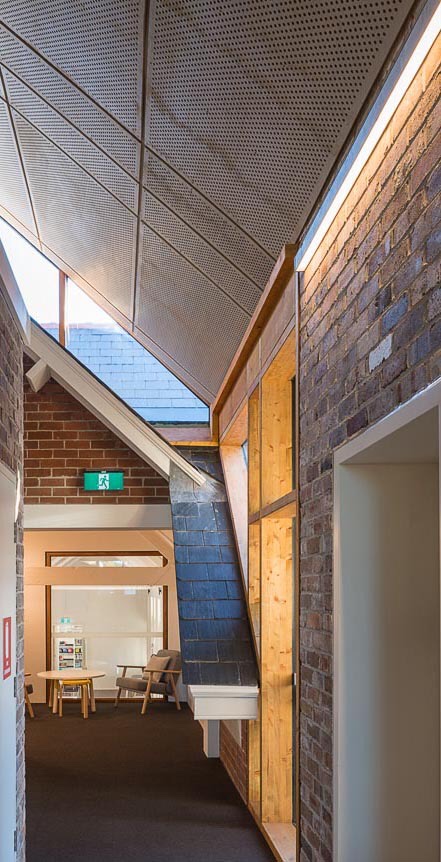 Slate tile roof blends into the new library space (picturecourtesy of Philip Noller and Inner West Council Library and History Services)