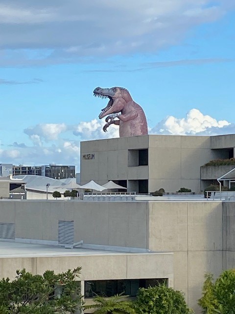 At the Library’s heart is a phenomenal five-storey atrium; the ground-level of which – the Knowledge Walk – is accessible seven days a week and has free wi-fi available 7am to 8pm daily. There are also balconies and lots of other spots for reading, working or relaxing. (FYI from a fifth-floor balcony I photographed a T-Rex bursting out of the roof of the nearby Museum!) The Library is also surrounded by some great public open space with shade and seating which is great for observing the antics of the resident bin chickens (Australian white ibis).