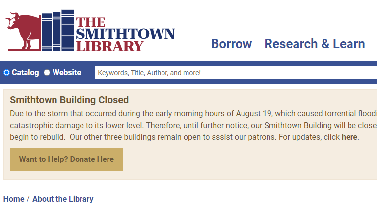 Due to the storm that occurred during the early morning hours of August 19, which caused torrential flooding, our Smithtown Building suffered catastrophic damage to its lower level. Therefore, until further notice, our Smithtown Building will be closed while we continue to assess the damage and begin to rebuild. Our other three buildings remain open to assist our patrons. For updates, click here.